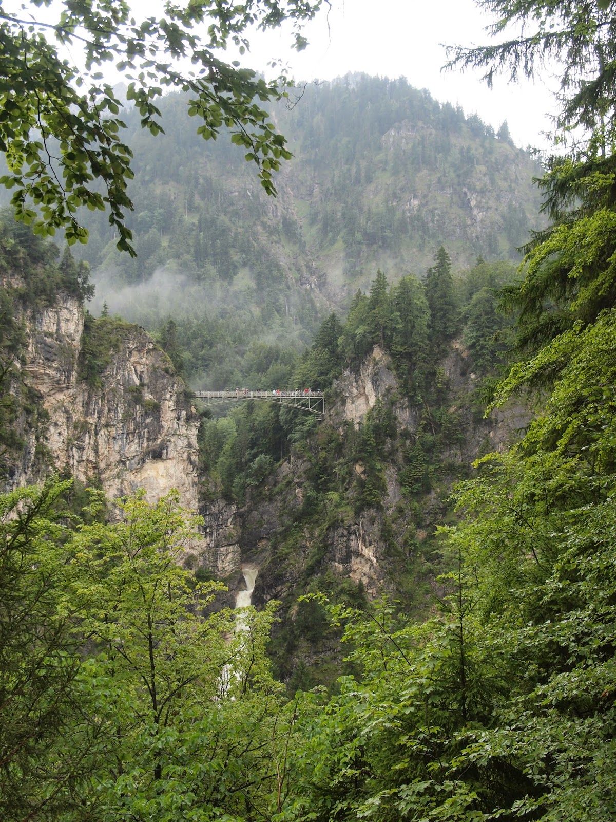 К Нойшванштайну подниматься надо в более высокую горку. Можно пешком, можно на автобусе или на конной упряжке. Про коней не знаю, а автобус довозит не до самого замка - там ещё минут 5-10 идти пешком до входа, по дороге любуясь видами на окрестности.